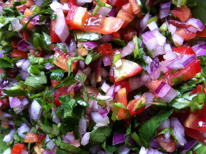 This fresh salsa, which suits any Mexican meal, is simply a combination of finely diced tomatoes, onions and fresh coriander seasoned with salt.