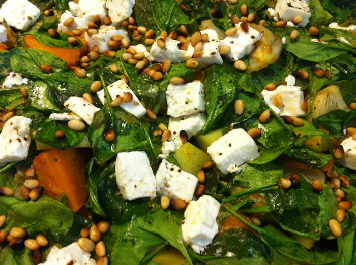 To make this dish, cut pumpkin, fennel and potato and roast in a moderate oven, seasoned with salt and pepper and drizzled with olive oil. When the vegetables are cooked, remove them from the baking tray and place fresh spinach leaves in the tray then put the roasted vegetables on top of the spinach, scatter with pieces of feta cheese and once again drizzle with olive oil and season with freshly ground black pepper. Return to the oven for 10-15 minutes. When ready to serve, garnish with toasted pine nuts.