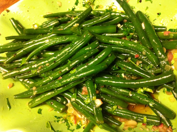 First steam the beans for 6 minutes and then drain and rinse them briefly in cold water to stop them cooking any further. For the dressing combine 4 tablespoons of good olive oil, 2 tablespoons of red wine vinegar, 2 tablespoons of very finely chopped red onion, 1-2 tablespoons of finely chopped parsley and a small finely diced clove of garlic. Season to taste with salt, freshly ground black pepper and a little sugar. Gently toss the dressing through the beans and then cover and allow to chill for at least one hour or even overnight. When serving, optional extras could include almonds, pimiento or chopped hard-boiled eggs.