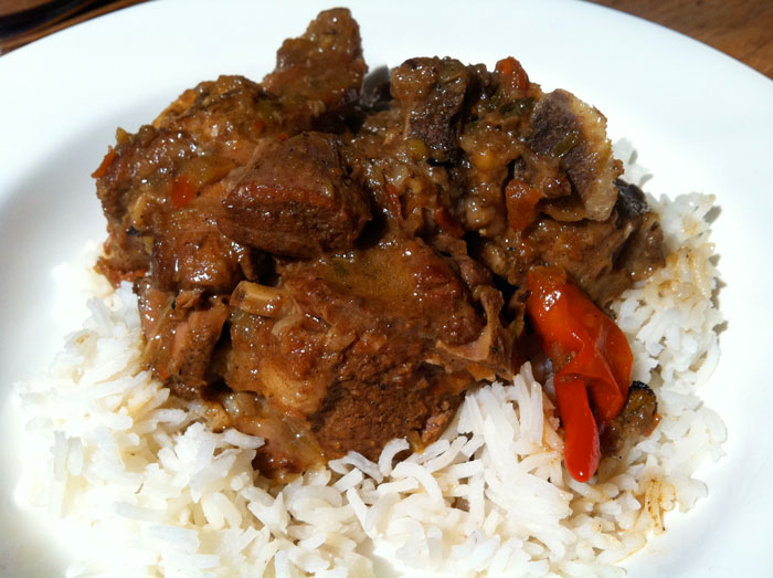 Put 1.35 kg (3 lbs) of bone-in goat pieces in a bowl and add 1½ tablespoons of curry powder, 1 teaspoon each of salt, black pepper, ginger and pimento, and 2 teaspoons of turmeric. Cover and marinate for 2 to 8 hours. When you’re ready to cook, heat ¼ of a cup of oil in a large pot over a medium heat and add 1 large chopped onion, 4 cloves of finely minced garlic and 1 teaspoon of curry powder. Cook for 2–3 minutes until dark brown (called ‘burning up’ the curry). Add a little coconut milk to create a thick and tasty paste. Add the goat to the pot and sauté until brown all over. Add 1 cup of water and the rest of a tin of coconut milk. Cover and cook over a medium heat for up to 2 hours or until tender. Stir occasionally and after 1 hour add another 1½ tablespoons of curry powder. You can add up to 2 teaspoons more curry powder to taste. If necessary add more water during cooking. When the goat is tender add 3 sliced spring onions, a generous amount of fresh thyme sprigs and 1 scotch bonnet chilli. You could also add some chopped potatoes at this stage if you want. Cook for a further 15 minutes. If you don’t want the curry too spicy, remove the scotch bonnet or leave it in longer for more heat. Cover the pot and cook for 30 minutes more until the meat is very tender and falling off the bone.