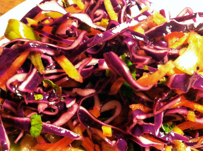 This fresh salad is a perfect foil for the curry. Made from finely sliced red cabbage, red peppers, spring onions and coriander it has a dressing of only lime juice and a pinch of salt.