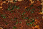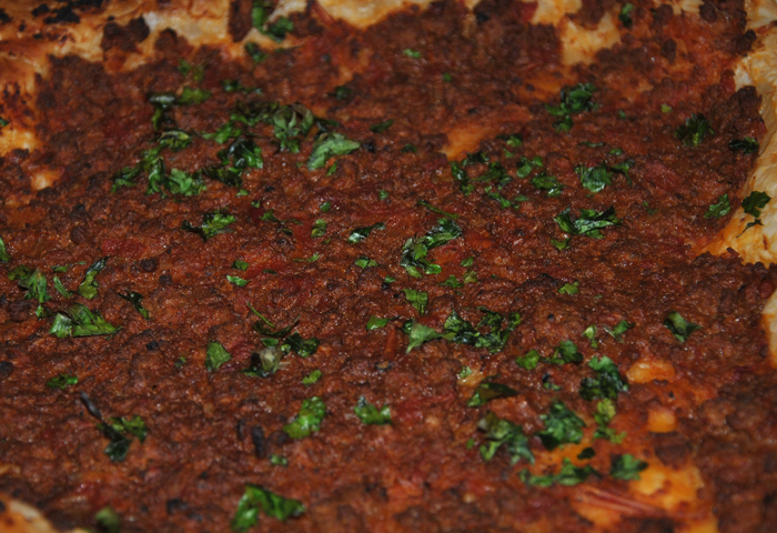 tomatoes and onions topped with chorizo, corn and green peppers;