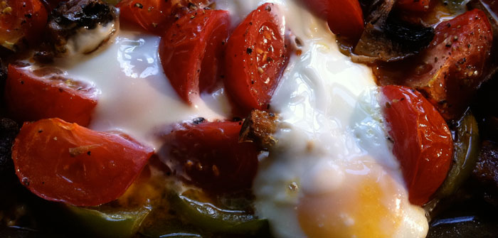 Baked eggs, tomatoes, green peppers, bacon and mushrooms