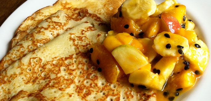 Buttermilk pancakes served with a fresh tropical fruit salad
