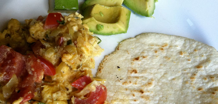 Huevos Mexicana (scrambled eggs with the colours of the Mexican flag – tomato, onion and green chilli) served with fresh tortillas and avocado,
