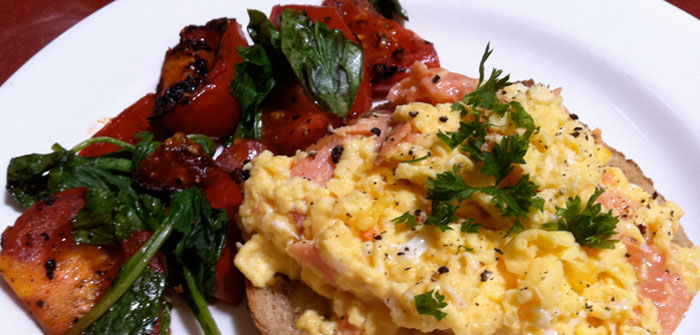 Smoked salmon scrambled eggs with quick-fried tomatoes and spinach