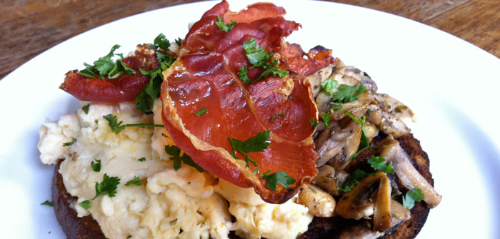 Scrambled eggs with rosemary and oregano mushrooms and crispy jamon,