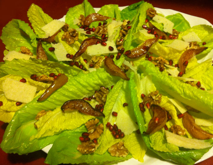 Complement this meal with a fresh salad. Mine was cos lettuce with roasted pear, parmesan, walnuts and pomegranate seeds dressed with a mustard vinaigrette.