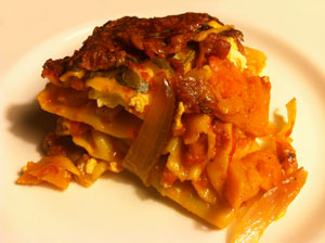 For this lasagna I used eggplant (aubergine), pumpkin, onions, peppers, zucchini and  fennel. Whichever vegetables you choose, cut them into thin slices and lay them on a baking sheet. Season with salt and pepper, drizzle with olive oil and bake in a moderate to hot oven until just cooked. Meanwhile take 2-3 cans of diced tomato and place them in a saucepan with some olive oil and 2-3 cloves of minced garlic. Bring this to a simmer and allow to cook, covered, for approximately 20 minutes. Now the lasagna is ready to be assembled. First, lay lasagna sheets over the bottom of your baking dish and cover with some tomato sauce. My first layer was slices of eggplant followed by more pasta and tomato. The next layer should be ricotta. Just slice the fresh ricotta and spread it over the pasta, sprinkling with grated pecorino. Another layer of pasta and tomato and my next layer was fennel and zucchini. Repeat the ricotta layer and then one more layer of vegetables – mine was pumpkin, onions and peppers. The final sheets of pasta go over the top, well covered with tomato and topped with a good melting cheese such as Colby or Mozarella as well as pecorino. Bake in a moderate oven for approximately 45 minutes until golden and bubbling.