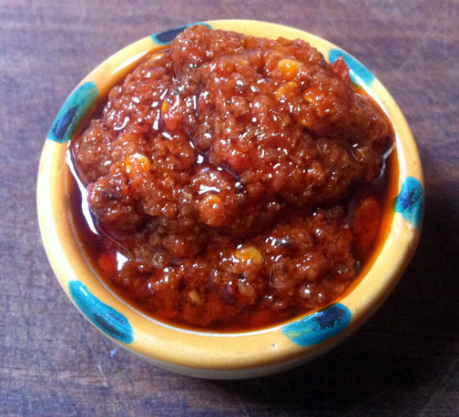 For some fiery heat use this home-made harissa as a condiment. Soak 40g (1½ oz) of Chinese long red dried chillis for at least half an hour. Roast and grind 1½ tablespoons of cumin seeds and 1½ tablespoons of coriander seeds. Finely dice 4 cloves of garlic. Drain the chillies and place in a food processor with the spices, garlic, salt to taste, 2 roasted red peppers, ½ a cup of tomato paste and 1 tablespoon of lemon juice. Process while adding ½ cup or more of good extra virgin olive oil until a good consistency is achieved. This keeps well in a jar if there is enough oil to cover the top of the chillies.