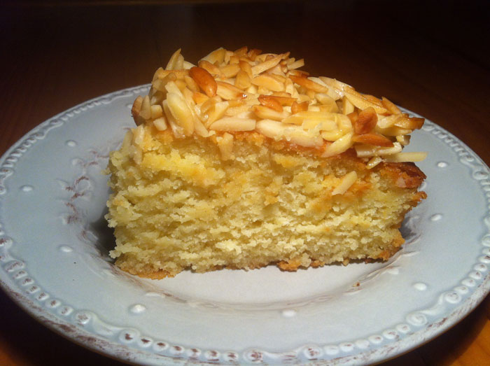 Preheat the oven to 150C (300F). In a food processor beat 115g (4 oz) of softened butter with 250g (8¾ oz) of sugar until creamy. Alternately add 4 large eggs, 185g (6½ oz) of self-raising flour, 185g (6½ oz) of dessicated coconut and ½ a cup of Greek-style yoghurt until everything is incorporated. Pour into a prepared cake tin and bake for 1½ hours. While the cake is baking combine 180 ml (6 fl oz) of water, 170g (7 oz) of sugar and 1 bunch of coarsely chopped mint in a saucepan and bring to boil, making sure all the sugar dissolves. Remove from the heat and allow to cool. When the cake tests clean remove it from the oven and raise the oven temperature to 180C (350F). Using a skewer make holes all through the cake. Strain the syrup and discard the mint leaves then pour the syrup evenly over the cake and allow it to soak in. In another saucepan combine 70g (2½ oz) of butter, 170g (7 oz) of honey and 170g (7 oz) of slivered almonds and heat just enough to combine. Spread this mixture over the cake and return the cake to the oven. Bake for a further 15 minutes or until golden brown. Cool in the tin.