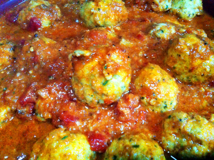 In a food processor place 500g (17 oz) of skinless and boneless firm white fish (we had Ling), 1 egg, 2 spring onions, 2 tablespoons of flat-leaf parley, 2 tablespoons of coriander, 55g (2 oz) of fresh bread crumbs, a pinch of saffron soaked in 1 tablespoon of warm water for 5 minutes, ¾ teaspoons of salt and some freshly ground black pepper. Process to a paste and with wet hands form into walnut-sized balls. Place on a tray and set aside in the fridge. For the sauce coarsely grate 1 brown onion and cook it in some olive oil over medium heat. Add 2 finely diced cloves of garlic, 1 teaspoon of paprika, ½ a teaspoon of harissa and ½ a teaspoon of ground cumin. Stir and add a can of peeled and diced tomatoes, 1 teaspoon of caster sugar, a little water if necessary and salt and pepper to taste. Cover and simmer for 15 minutes. Add the fish balls, making sure they settle into the sauce. Cover and simmer gently for 20 minutes before serving.