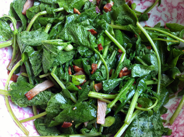Wash and dry the radish greens and place them in a salad bowl with 2 chopped spring onions and some freshly ground black pepper. Chop up 4 pieces of bacon and fry them in a small pan until crisp and rendered. Add ¼ of a cup of vinegar and 2 tablespoons of water allowing the dressing to become hot. Pour it over the greens and toss until the leaves wilt.