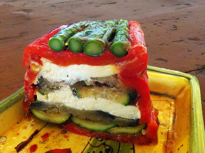 You will need 6 large red peppers, 4-6 zucchinis, 2-3 large eggplants, 1-2 bunches of asparagus, 450g (1 lb) of fresh ricotta, a little vegetable stock and some gelatine. First cut the peppers into large pieces. The best way to do this is to cut off the two ends and then cut the rest into 3-4 pieces. Slice the eggplants and zucchini into long slices  approximately as thick as a pencil. Place the peppers under a hot grill, skin side up, until they char and blister. Place them in a well-sealed container or plastic bag and put them in the fridge – this will make them sweat and soften making them easy to peel. Meanwhile, brush the eggplant and zucchini slices with a little olive oil, season with salt and grill in batches under a grill or on a griddle until just tender. Set aside. Blanch the asparagus un boiling water for 3 minutes and set aside. Now peel the peppers keeping the pieces as large as possible. Prepare a terrine dish or loaf pan by lining it with cling wrap. Lay the asparagus pieces on the bottom then line the bottom and sides with red pepper. In the centre layer slices of zucchini, slices of eggplant and sliced fresh ricotta. When the dish is nearly full use the remaining pieces of red pepper to cover the other layers. Heat 1 cup of  vegetable stock and add 2 soaked sheets of gelatine or 2 teaspoon of powdered gelatine and pour the stock slowly into the terrine. You will have to wait for any bubble of air to rise and you may not need all the stock. When you are satisfied that all the gaps have been filled cover the terrine with more cling wrap and weigh it down with something flat and quite heavy. Refrigerate overnight. To remove the terrine try pulling the cling wrap gently. If this doesn’t immediately work, place the dish briefly into some warm water and try again.