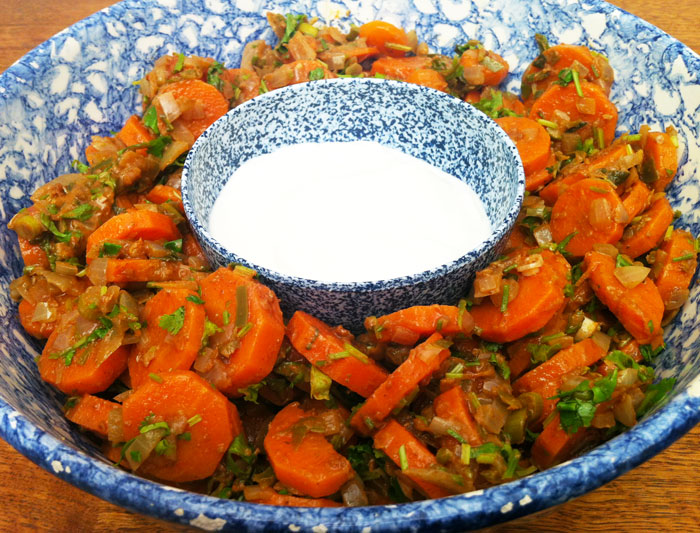 Peel and slice carrots then cook them in boiling water until just tender. Drain and leave to dry. Meanwhile, fry 1 finely chopped onion in some olive oil until soft and browning a little. Add 3 crushed cloves of garlic, 2 sliced green chillies, a finely sliced spring onion, a pinch of ground cloves, ¼ of a teaspoon of ground ginger, ½ a teaspoon of ground coriander, ¾ of a teaspoon of ground cinnamon, 1 teaspoon of ground cumin, 1 teaspoon of sweet paprika, 1 tablespoon of white wine vinegar, 1 tablespoon of caster sugar, 1 tablespoon of finely diced preserved lemon rind and the carrots. Stir to combine, remove from the heat, season well with salt and leave to cool. When cool stir in a generous handful of finely chopped fresh coriander (cilantro). Serve at room temperature with some chilled, salted greek yoghurt.