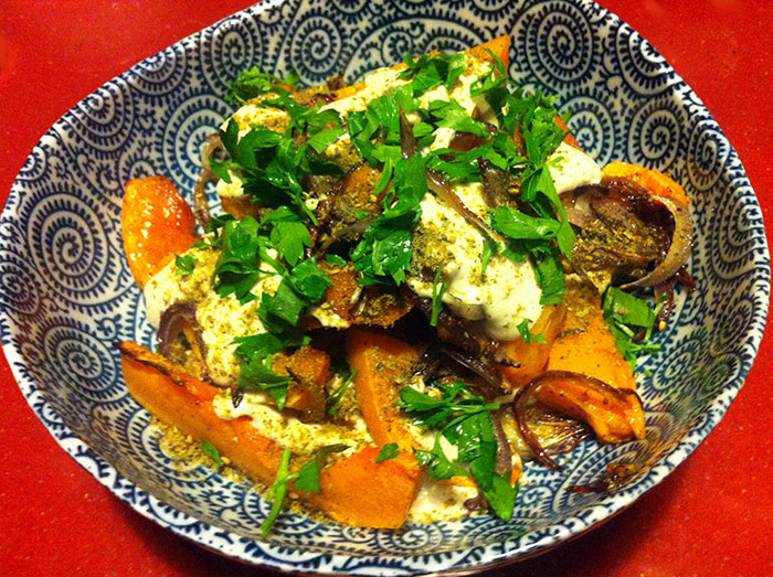 This butternut pumpkin (squash) and onion salad has a wonderful tahini dressing. Cut a large butternut pumpkin and 2 red onions into wedges and place them in a bowl. Add 3 tablespoons of olive oil, 1 teaspoon of salt and freshly ground black pepper to taste and toss well. Spread them on a baking sheet and roast in a moderate oven for approximately 40 minutes or until the vegetables are cooked and colouring a little. Remove them from the oven and leave to cool. Meanwhile combine 3½ tablespoons of tahini paste with 1½ tablespoons of lemon juice, a crushed clove of garlic, 2 tablespoons of water and ¼ of a teaspoon of salt. Whisk well until you achieve a consistency like thin honey. To serve, arrange the roasted vegetables on a platter or in a bowl and drizzle with the tahini dressing. The original recipe includes a scattering of toasted pine nuts. Sprinkle with 1 tablespoon of za’atar (a mixture of dried herbs and sesame seeds available in Middle Eastern stores) and garnish with flat-leafed parsley.
