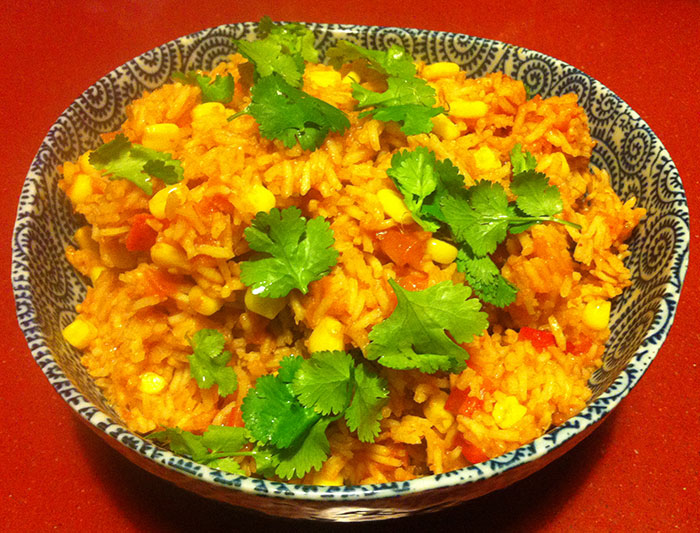 In a food processor purée 1 can of tomatoes with 1 chopped onion. Place this mixture in a saucepan and cook for 10-20 minutes. Add 1½ cups of water and bring to boil. In another saucepan heat some corn oil and add 1½ cups of long grain rice. When the rice is heated and beginning to become opaque add the tomato mix, 1 cup of corn kernels, a finely diced red pepper, a finely sliced red chilli and salt to taste. Cover and cook on low heat for 15-20 minutes until all the liquid is absorbed. Serve with a garnish of fresh coriander (cilantro) and a squeeze of fresh lime juice.