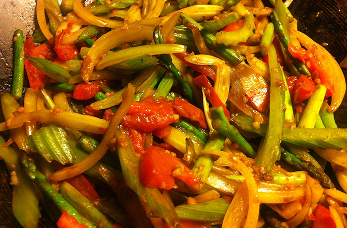 An Asian stir-fry of celery, asparagus, onion and tomatoes.