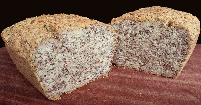 My first flourless almond bread, although delicious with butter, was unsuited to more savoury toppings. With the addition of flaxseed meal and olive oil this new version is more savoury. Enjoy it with bacon and eggs, cheese, tomatoes, mushrooms, avocado or just about anything. It toasts well and can be used for sandwiches.