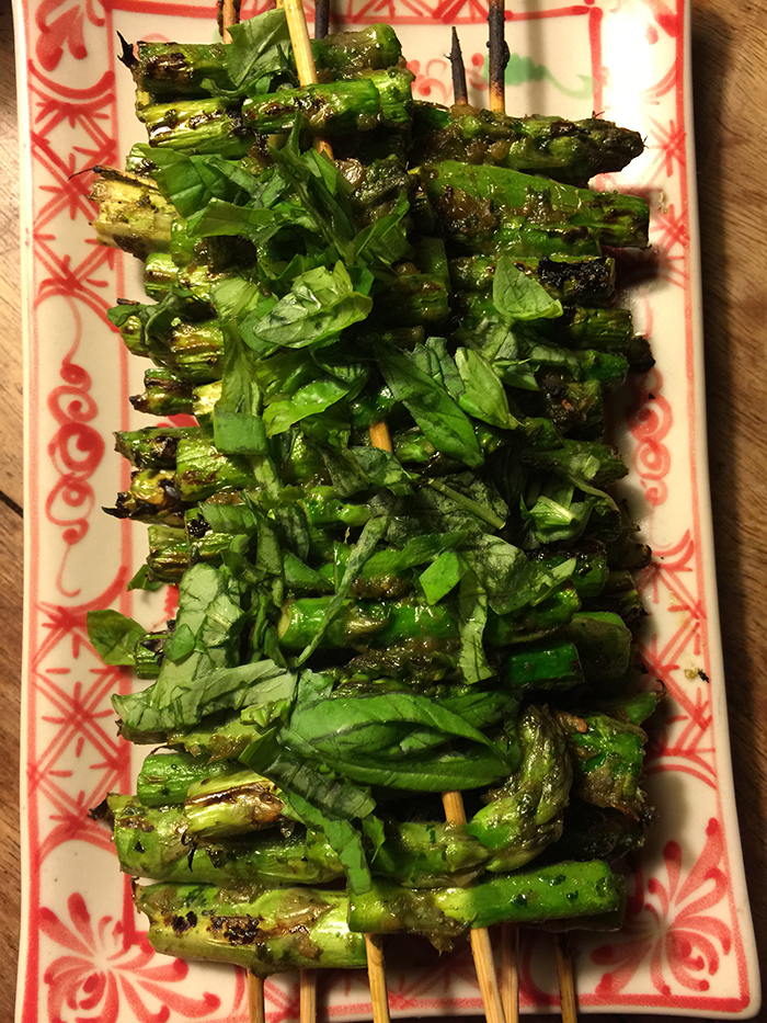 In a mortar and pestle make a paste of 8 coriander (cilantro) roots, 4 garlic cloves, 50g (1¾ oz) of ginger, 1 teaspoon of white peppercorns and 2 teaspoons of vegetable oil. Combine this paste with 2 teaspoons of oyster sauce, 1 teaspoon of fish sauce and some more oil. Spread the mixture over skewered lengths of asparagus and cook over gentle heat. Garnish with fresh basil.