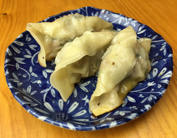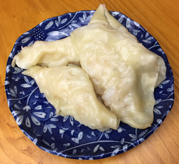 This filling was made with freshly minced pork sirloin. We added a large amount of finely chopped Chinese chives and seasoned with salt and white pepper. To serve these dumplings we pan-fried them in some peanut oil until brown then added 5 or 6 tablespoons of water, covered and steamed them until cooked.