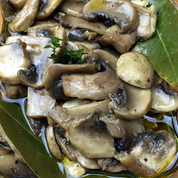 The mushrooms can be sliced, halved or quartered depending on size. Gently heat 2 tablespoons of olive oil with some bay leaves and a generous amount of freshly ground black pepper. Add the mushrooms and a few sprigs of thyme. Cover the pan and cook the mushrooms in their own juices, shaking the pan from time to time. When they are cooked but still a little firm transfer them to a bowl and add another 2 tablespoons of olive oil, 1 tablespoon of red wine vinegar and some fresh thyme. Allow at least 1 hour to marinate.
