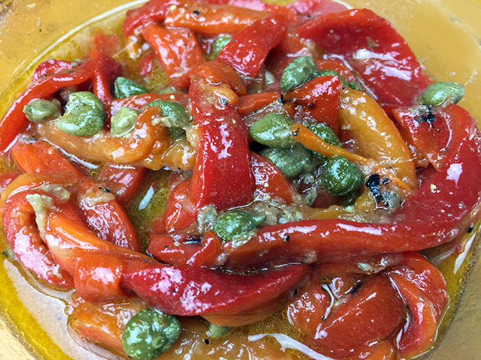 The red peppers should be roasted or barbecued whole until the skins are charred. Place them in a sealed container or plastic bag and allow them to sweat so that the skin can be easily removed. Cut them into strips and add some capers to taste. Crush 1 clove of garlic with 2 or 3 anchovies and mix with olive oil and freshly ground black pepper. Add to the peppers and allow them to marinate.