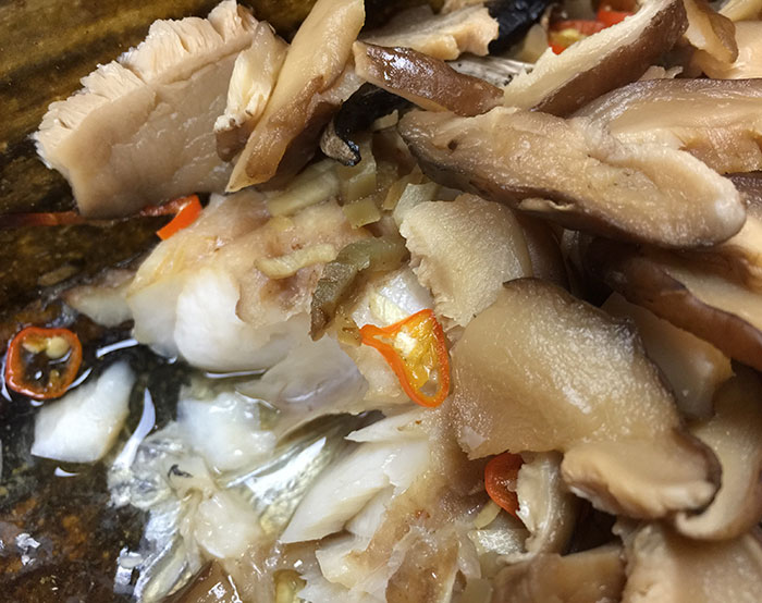 Lay 2 large white fish filets (skin side down if it’s still attached) into the bowl you’ll use for steaming. Make sure it’s lying as flat as possible and not doubled over and drizzle it with a little soy sauce. Scatter a 2.5cm (1″) piece of finely diced fresh ginger, a 5cm (2″) piece of Szechuan preserved vegetable (these are usually available canned at Asian food stores) and 2-3 finely sliced red birdseye chillies over the fish. Cover all of this with a generous layer of sliced mushrooms (button or shitake are both good). Place the bowl in the steamer, cover and cook for 5-10 minutes or until the fish is cooked and flaking. Serve with a vegetable stir-fry and steamed rice.