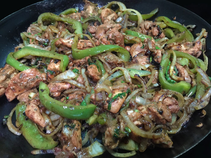 To make the fajitas cut 3-4 chicken thighs into strips and put them in a bowl. Add the juice and finely grated zest of 1 lemon, 2 tablespoons of sugar, 2 teaspoons of dried oregano, ½ a teaspoon of cayenne pepper and ½ a teaspoon of chilli powder. Mix well and marinated for 30 minutes. Meanwhile slice 1 large onion and 1 green pepper into strips. Remove the chicken from the marinade (reserving the marinade) and sear quickly over high heat – a barbecue is ideal for this as it adds great flavour. Set aside. In a large pan fry the onion and pepper over medium heat until the onion is wilting then add the chicken and any extra marinade and cook through. Serve with fresh tortillas.