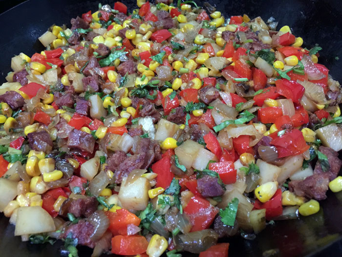 For the chorizo mix chop up a spicy chorizo and fry it over low heat with a large chopped onion. When the onion has wilted add a finely diced potato and fry until the potato is almost cooked. Add a diced red pepper and some corn kernels and continue to cook until the peppers soften. Lastly add a handful of chopped coriander (cilantro).