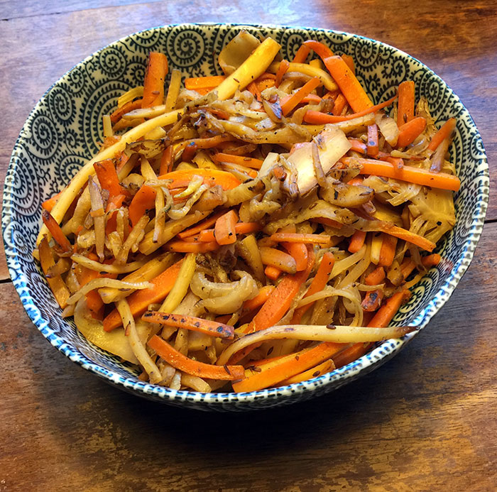You can make this with whichever root vegetables you have to hand. We had carrots, parsnips, turnips and fennel. Celeriac and beetroots would be good too. Peel and cut all the vegetables into thin matchsticks or julienne. Sprinkle with a little salt and leave in a colander for about an hour. Squeeze out any excess moisture. Heat some olive oil in a large pan. Add 1 teaspoon of roughly crushed cumin seeds and cook for 1 minute before adding the shredded vegetables. Stir-fry for 5 minutes then add the juice and zest of 1 orange, 2 teaspoons of honey, 1-2 tablespoons of red wine vinegar and a pinch of cayenne pepper. Cook for a further 5 minutes. Season with salt to taste.