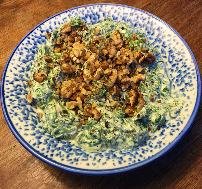 Cook 250g (9 oz) of spinach leaves in a little olive oil until wilted. Drain well, allow to cool and squeeze out any excess moisture. Chop roughly and mix with 1 clove of crushed garlic, 1 chopped red chilli and 1 cup of yoghurt. Season well and serve sprinkled with a pinch of dried mint, and 50g (1¾ oz) of toasted walnut pieces.