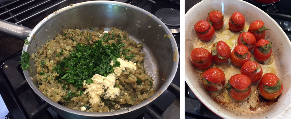To accompany the lamb we stuffed large cherry tomatoes. After cutting the tops off the tomatoes and carefully scooping out the flesh and seeds, we seasoned them with salt and placed them upside down on the board, allowing any liquid to drain. The eggplants (aubergines) were cut in half lengthwise and baked (skin side up) until soft. In a saucepan we sautéed very finely chopped shallots and garlic then added the chopped eggplant pulp, some finely chopped rosemary, chopped parsley, a little chickpea flour to bind and salt and pepper. We then filled the tomatoes and put the lids back on for roasting.