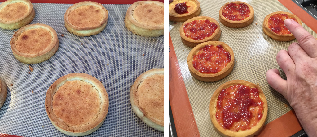 When they were cooked and cooled, we spread a little strawberry jam onto each tart shell and arranged fresh strawberries on top.