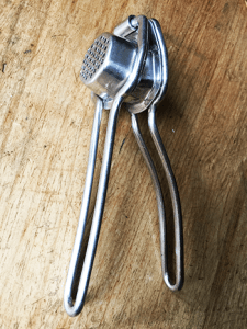 I’ve been interested in native Australian finger limes for a while so I chose to plant a blood lime as it suits the cool climate here. A cross between red finger lime and Ellendale mandarin, their colour ranges from lime to burgundy and they’re a little sweeter then standard limes. The skin and flesh can both be eaten and the juice is both in and around the little vesicles which pop in your mouth. As they’re so small, I thought laterally about how to juice them and I came up with the idea of a garlic press! It’s a bit like a mini Mexican-style lime squeezer and as long as it’s stainless steel the garlic taste won’t linger.
