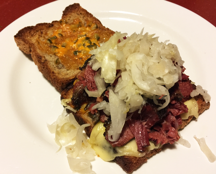 To make this you will need some beef brisket with most of the fat removed. For a 2¼kg (5 lb) brisket make a brine of 4 litres (1 gallon) of water, 1½ cups of kosher salt, 6 teaspoons of pink curing salt, 1 cup of sugar, ½ a cup of dark brown sugar, ¼ of a cup of honey, 5 minced cloves of garlic and 1 tablespoon of pickling spice. Place the beef in the brine with a plate on top so that it is completely submerged and refrigerate for 3 days. Next, remove the beef, rinse and dry it and discard the brine. In a spice mill or mortar and pestle grind 1 tablespoon of black peppercorns and 1 tablespoon of coriander seeds. Coat the beef evenly with this mixture. Now the beef needs to be hot smoked, or cooked very slowly over a charcoal barbecue with some wood chips for extra smoke. The internal temperature should be 66ºC (150ºF) when it’s cooked. The final step is to steam the pastrami. Heat your oven to 140ºC (275ºF) and place the beef on a rack over a tray with 2.5cm (1″) of water in it. When the water is simmering, cover the pastrami and steam it in the oven for 2-3 hours. Now it’s ready to serve.