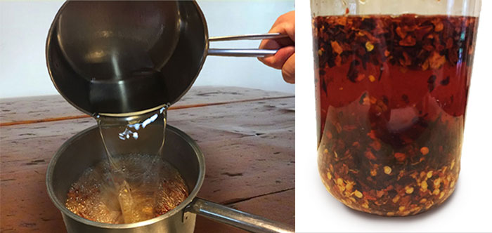 To make this chilli oil you will need 110g (4oz) of chilli flakes. If you can’t find the correct chilli flakes you can buy whole dry chillies and crush them in a food processor. Put the chilli flakes in a heatproof bowl or stainless steel saucepan and add some salt to taste as well as aromatics of your choice such as Sichuan peppercorns, star anise, cinnamon stick, bay leaf, ginger or five spice. The addition of aromatics is a personal preference which varies from region to region and even family to family in China. Next you need to heat a little more than 2 cups of oil. I used peanut oil but any vegetable oil without too much flavour would work. Heat the oil over a high flame to about 200ºC (400ºF). Remove from the heat and allow it to cool to around 135ºC (275ºF). Carefully pour the hot oil over the chilli flakes. It should sizzle and bubble releasing wonderful toasty aromas. Allow the finished chilli oil to cool before decanting into jars to store.