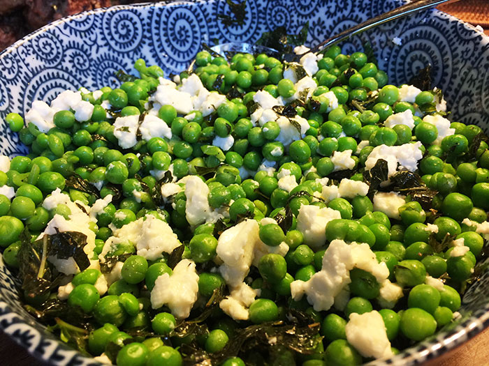 As a side dish try these peas with feta and mint. Cook the peas in salted water until just cooked. Drain, place them in a bowl and add crumbled feta, plenty of fresh mint, freshly ground black pepper and a drizzle of good quality olive oil;