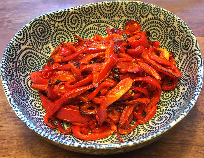 And these roasted red peppers. Simply slice into long strips, toss with salt, pepper and olive oil and roast in a hot oven until slightly charred.