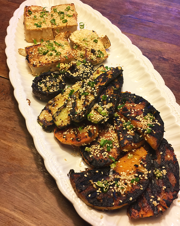 You will need a firm tofu for this meal. For the vegetables I used butternut pumpkin (squash), zucchini (courgettes) and whole Swiss brown mushrooms but the choice of vegetables is flexible as long as they keep their shape reasonably well. Combine white miso paste with some sesame oil, a little brown sugar and enough water to make a paste which is thin enough to spread and thick enough to stick. The amount of ingredients here are flexible as miso paste varies quite a lot and you must taste this mixture to make sure it’s not too salty or too sweet. Cut the tofu and vegetables to the size you wish to serve and coat them all with vegetable oil. If you don’t have a griddle or barbecue you can roast the vegetables in the oven. Cook them first until they are a little brown and softening then brush them with miso paste and continue to cook until coated and delicious. Watch them carefully at this stage as the miso and sugar can burn quite easily. Serve garnished with finely sliced spring onion and toasted sesame seeds.