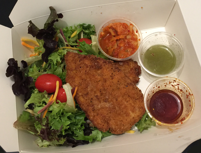 KFC (Korean fried chicken) with a wasabi and honey dipping sauce, salad and a side of kimchi from Bae Bae’s Kitchen;