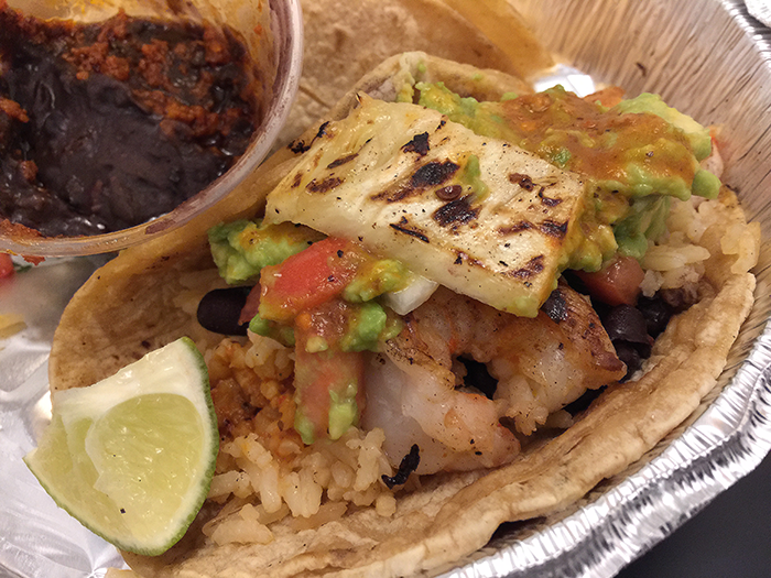 Tacos with grilled shrimp, rice and beans, guacamole, pineapple and black beans on the side from Bea Taco Town;