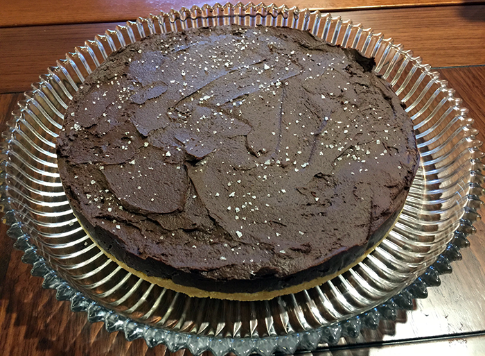 To make the crust place a packet of plain sweet biscuits in a food processor, add half the weight of the biscuits in softened butter and process until all the butter is incorporated. Press into a lined 23cm (9″) springform cake tin and set aside in the fridge. For the filling use a stand mixer with a paddle. Combine 1â…“ cups of cream cheese, Âľ of a cup of sour cream, ÂĽ of a cup of light brown sugar, ÂĽ of a cup of cocoa powder, 3 tablespoons of softened unsalted butter, 2 teaspoons of vanilla and ½ a teaspoon of kosher salt. Beat on medium speed until smooth and creamy. Meanwhile melt 400g (14 oz) of 70% dark chocolate and allow it to cool slightly. Reduce the speed of the mixer to medium low, pour in the melted chocolate and mix until combined. Spoon the mixture into the prepared crust and chill for at least 30 minutes. Serve sprinkled with flaky sea salt.