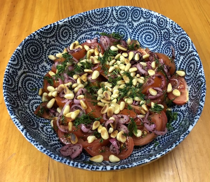 Peel and slice 1 large shallot into rounds and combine it in a small bowl with â…› of a teaspoon of salt, 1½ tablespoons of sumac and 2 teaspoons of white wine vinegar. Mix together with your hands so the sumac gets massaged into the shallots and set aside for 30 minutes. Meanwhile prepare your tomatoes. Mine were all one size but if you have a good mixture of tomatoes cut them into similar sizes and put them in a bowl. Add 2 tablespoons of olive oil, 15g of dill leaves, â…“ of a teaspoon of salt and plenty of freshly ground black pepper. Toss gently to combine. Now toast 25g or more of pine nuts until just golden and set aside. When you’re ready to serve arrange the tomatoes in your serving dish and spread the shallots over the top. Scatter with pine nuts and garnish with more fresh dill.