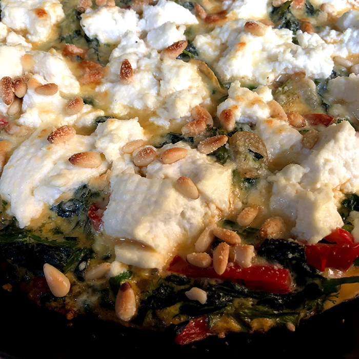 Wash and trim a bunch of spinach and blanch it in boiling salted water until just wilted. Drain and cool it under cold running water then squeeze out the excess water. Chop the spinach roughly and set aside in a large bowl. Heat some olive oil in a pan and fry 1 sliced onion and 1 sliced red pepper over moderate heat until the onion is soft and translucent. Add 2-3 cloves of minced garlic and cook just a little longer. Add the onions and peppers to the bowl of spinach and combine with 4- 6 eggs, salt and freshly ground black pepper to taste. Wipe your pan clean and heat some more olive oil. Pour in the egg mixture and cook over low heat. When the eggs have cooked halfway up, dot the fresh ricotta over everything and top with pine nuts and finely grated pecorino or parmesan. Place under a hot grill until the egg is firm and the pine nuts are golden brown. Serve from the pan.
