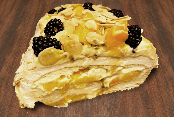 When you’re ready to assemble the roulade, place a clean tea towel over the meringue and invert it onto a work surface. Peel off the baking paper and spread about â…” of the cream evenly over the meringue and then cover it generously with the fruit. I put mangoes and passionfruit into the roulade but saved my blackberries for the top. You can also add toasted almond slices at this stage but I opted to put them only on the top. With the help of the tea towel, roll the meringue into a log shape and then carefully pull away the tea towel. Slide the roulade onto a serving platter with the seam facing down. Top with the remaining cream, fruit and toasted almonds and serve.