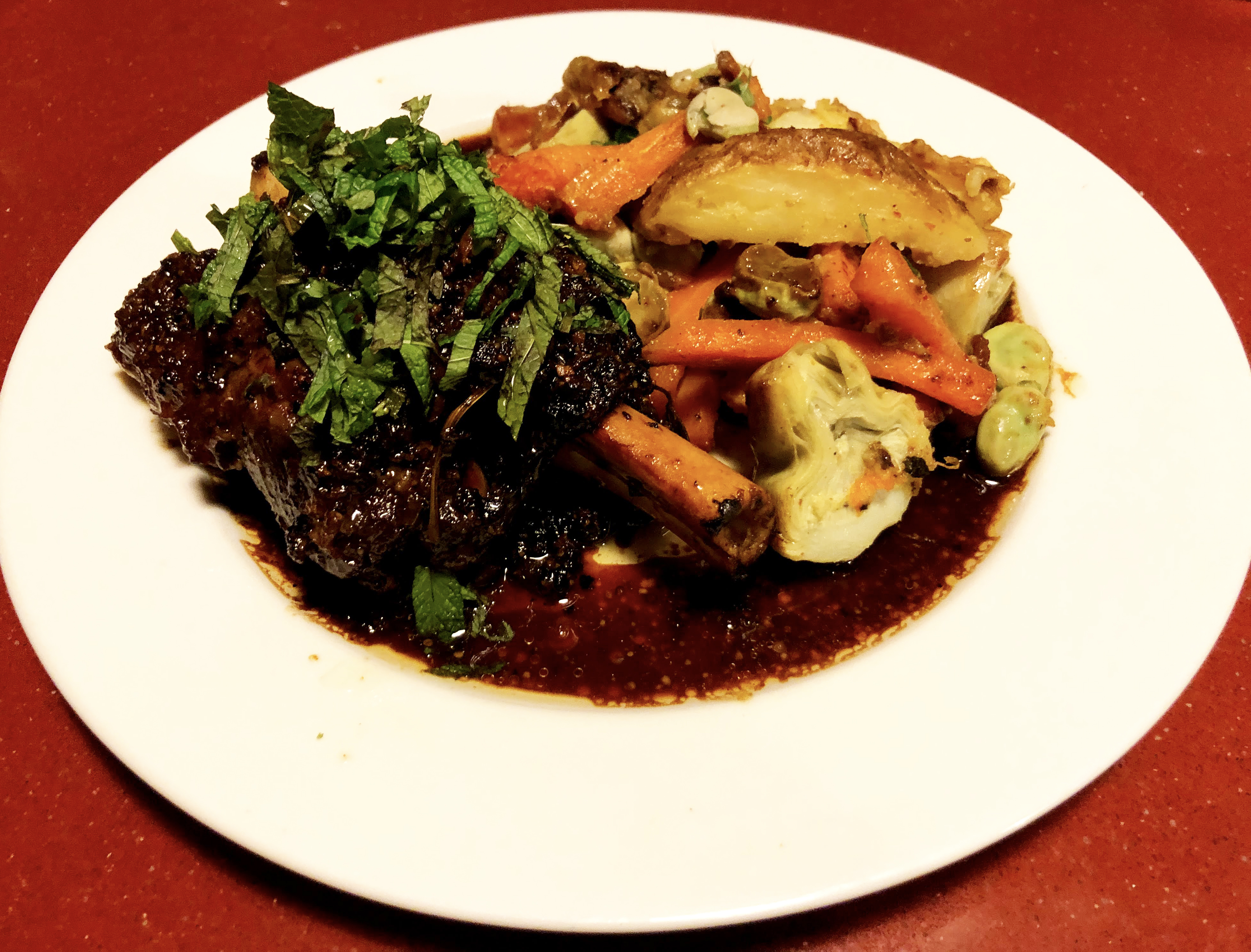 Preheat your oven to 180ºC (350ºF). Season 4 lamb shanks with salt and freshly ground black pepper. Heat some olive oil in a heavy dutch oven over high heat and sear the lamb on all sides until brown. Add 2 finely minced shallots and 4 finely minced cloves of garlic and cook briefly until fragrant. Pour in 1 cup of dry white wine and boil for a minute. Now add 2 cups of stock, 2 tablespoons of Worcestershire sauce and 2 tablespoons of whole grain mustard. Top with ½ a bunch of mint still on the stem. Cover and transfer to the oven for at least 2 hours. Remove the lamb and skim any excess fat from the juices. Reduce the liquid if necessary and check the seasoning. Serve the lamb with the sauce poured over it and garnish with more fresh mint.