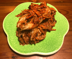 To split a Napa cabbage without losing any leaves, make a short cut in the base and tear the cabbage in half. Repeat and make quarters and even eighths, depending on the size of your cabbage. Dunk the pieces in water to wet them and allow them to drain. For one cabbage you will need 45g (½ oz) of natural sea salt. Sprinkle the salt evenly between all the leaves of the cabbage and let the cabbage rest in a bowl for 2 hours, turning every 30 minutes or so. Meanwhile, prepare the rest of the ingredients. First combine â…“ of a cup of water with 2 teaspoons of glutinous rice flour in a small saucepan. Mix well and cook over medium heat for about 10 minutes until it starts to bubble. Add 2 teaspoons of sugar and cook for 1 minute more, stirring. Remove from the heat and allow to cool. When cooled, pour this slurry into a large mixing bowl and add 8 finely diced cloves of garlic, 1 teaspoon of minced ginger, 1 small diced onion, 4 teaspoons of fish sauce, and â…“ of a cup of Korean hot pepper flakes (gochugaru). The recipe included chopped fermented shrimp but as I didn’t have any I soaked a few dried shrimp, chopped them and added them with their soaking water. Mix well until the mixture is a thin paste. Add â…“ of a cup of radish matchsticks, a small carrot cut into matchsticks and 2 chopped spring onions. Mix well. When the cabbage is soft, spread some of this paste between each of the leaves of the cabbage and when each piece is finished, fold it into a parcel and put it into your fermenting jar or container. Try some of the kimchi fresh – it’s delicious. Allow the rest to ferment for 3 days before transferring to the fridge. Serve it as a side dish or use it to make meals like fried rice, stew or pancakes.