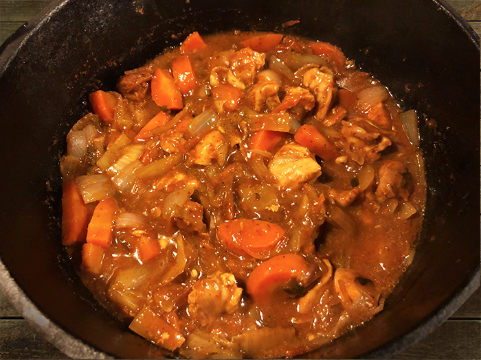 This kimchi stew was made with chicken. Cut 3 chicken thighs into pieces, add 1 large chopped onion, 2 sliced carrots and 1 cup of chopped kimchi. Sweeten with mirin or sugar and add soy sauce and salt to taste. Put everything in your pot together and cook over medium heat until the chicken is cooked and the carrots tender. If the sauce needs thickening use a little cornflour mixed with cold water. Serve with steamed rice.Â