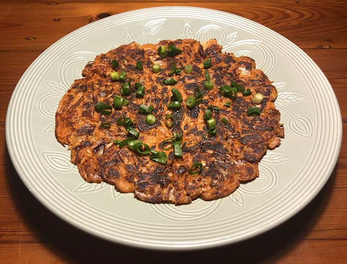 Kimchi pancake is a popular snack in Korea and a good way to use old kimchi. Mix 1 cup of chopped kimchi with a little of its liquid, ½ a cup of flour and 1 egg and season to taste. Fry over medium heat until crisp. Garnish with chopped spring onions and serve with a dipping sauce of soy sauce, sugar and rice vinegar.